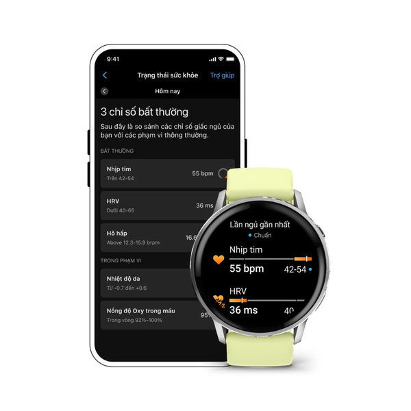 Nhận điểm số giấc ngủ và hướng dẫn cá nhân hóa về thời gian ngủ và cách cải thiện giấc ngủ. Thậm chí theo dõi các giai đoạn ngủ và giấc ngủ ngắn khác nhau — và xem các số liệu quan trọng, chẳng hạn như trạng thái HRV và nhiệt độ da3, để hiểu rõ hơn về sức khỏe của bạn. Ngoài ra, với tính năng căn chỉnh giấc ngủ, hãy xem bạn đã căn chỉnh giấc ngủ của bạn phù hợp với nhịp sinh học như thế nào, và sự nhất quán trong giấc ngủ.