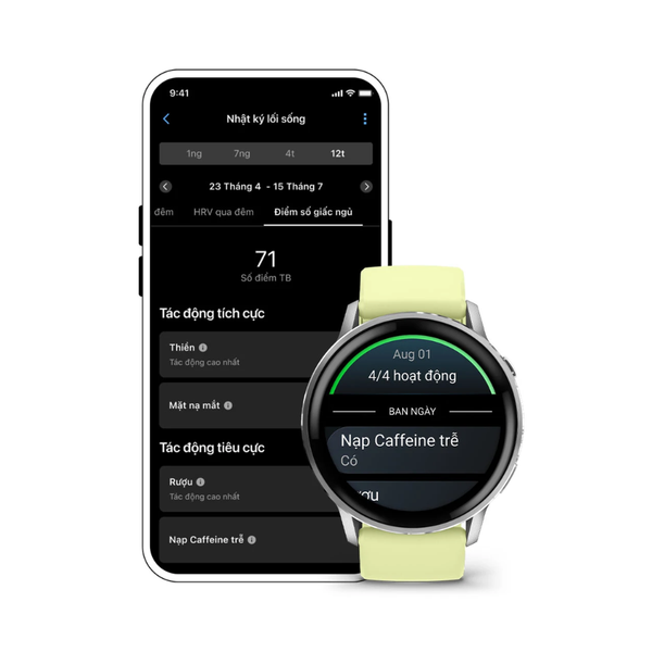 Ghi lại các hành vi tùy chỉnh hoặc cài đặt sẵn — chẳng hạn như lượng caffeine và rượu tiêu thụ — và xem báo cáo về cách những lựa chọn lối sống đó ảnh hưởng đến giấc ngủ, căng thẳng và HRV của bạn3 trong ứng dụng Garmin Connect. Nhờ đó, bạn có thể đưa ra những quyết định có ý thức hơn về sức khỏe.